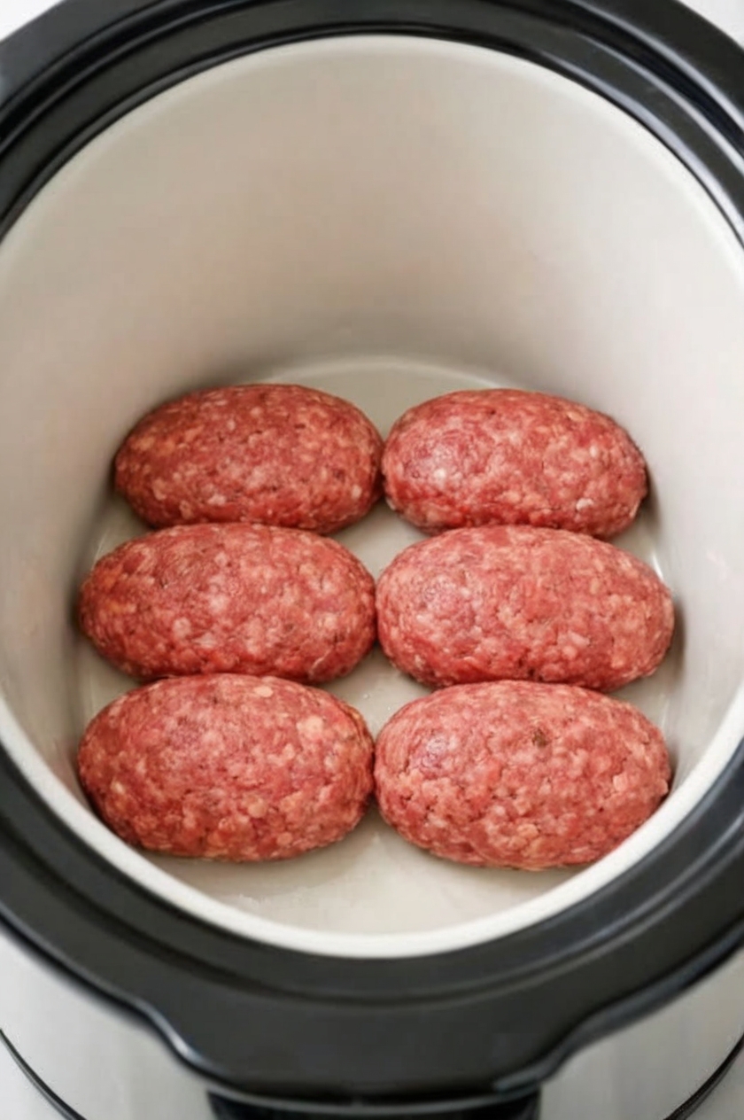 Place the raw beef patties into the bottom of your slow cooker. It is perfectly fine if they overlap slightly; they will shrink as they cook.